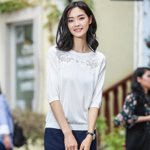 始终美2017春装新款天丝V领针织衫女套头简约七分袖针织打底衫薄