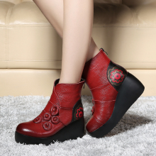 民族风秋冬真皮短靴棉靴坡跟中年女靴子厚底妈妈鞋加绒短筒休闲靴