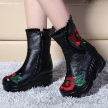 民族风女鞋中筒靴女真皮坡跟棉靴加绒女士中靴高跟厚底绣花靴子冬