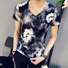 夏装新款男士短袖t恤 夏季V领韩版修身上衣服青少年半袖花体恤潮