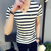 夏季修身短袖T恤男士休闲上衣服青年韩版V领打底衫条纹体恤夜店潮