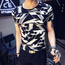 潮牌短袖T恤男士韩版修身圆领印花体恤上衣服夜店发型师半截袖潮