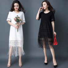 2017春夏新款蕾丝流苏连衣裙韩版时尚圆领短袖仙气镂空拼接中长款