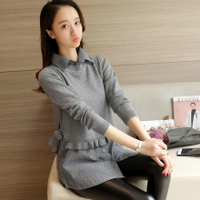 韩版女装春秋新款套头毛衣针织衫假两件中长款上衣宽松马甲打底衫