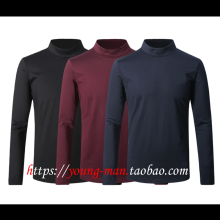 丝光棉半高领打底小衫男士长袖加绒体恤潮 修身男秋衣纯色刺绣t恤