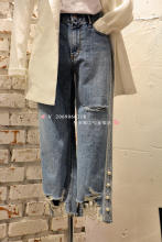 yellow 兔美酱韩国东大门代购 女士破洞珍珠毛边牛仔裤