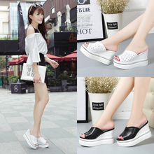 真皮松糕坡跟凉拖鞋女夏2017新款时尚室外厚底拖鞋鱼嘴超高跟外穿