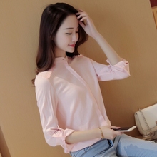 2016新款女装韩版棉麻衬衫女九分袖潮打底衫V领显瘦百搭学生上衣