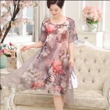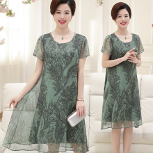 夏装妈妈装桑蚕丝短袖连衣裙中年真丝40-50岁加肥加大码200斤雪纺