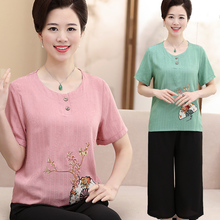 胖妈妈装加肥加大码套装中年40-50岁短袖T恤+七分裤子中老年棉麻