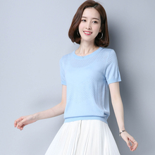 韩版女装中袖T恤女夏季宽松薄上衣短款镂空针织衫纯色百搭打底衫