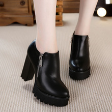 春季流行简约粗跟高跟鞋2017新款侧拉链时尚女鞋防水台圆头单鞋