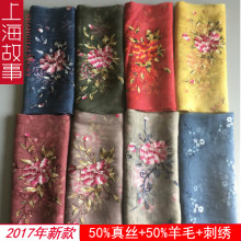 上海故事春秋桑蚕丝真丝羊毛刺绣围巾纯色女士绣花长丝巾紫色披肩