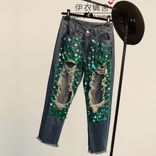 欧洲站2017春夏新款亮片破洞牛仔裤女潮流个性九分裤微垮哈伦裤
