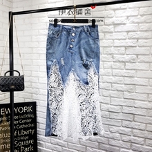 2017韩版春装新款破洞蕾丝拼接牛仔半身裙中长款包臀裙时尚鱼尾裙