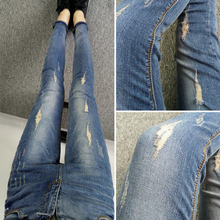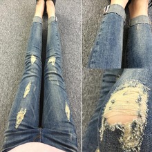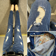 牛仔裤女 九分裤小脚裤薄款高弹修身破洞乞丐磨破超显瘦欧美包邮