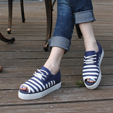 人本新款春夏季甜美低帮系带女鞋鱼嘴条纹正品时尚帆布鞋