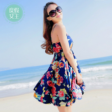 度假女王韩版女装修身显瘦印花吊带连衣裙波西米亚沙滩短裙