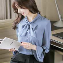 春季大码宽松蝴蝶结雪纺衫长袖韩版喇叭袖女士衬衫白色打底衫上衣
