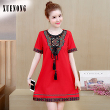 雪侬民族风大码女装夏装2017新款t恤胖mm中长款棉麻刺绣花连衣裙