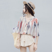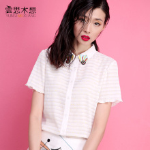 云思木想夏季原创刺绣压褶撞色波点修身短袖衬衫女81797