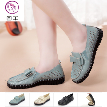 母羊新款牛皮夏季凉鞋透气洞洞鞋妈妈鞋凉鞋中老年人平底休闲女鞋