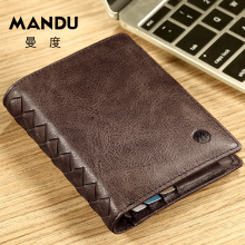 曼度新品编织钱包男士短款牛皮纯手工钱夹横款多卡位青年钱包
