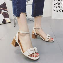 2017夏季新款粗跟凉鞋女高跟时尚蝴蝶结一字扣带韩版罗马露趾女鞋