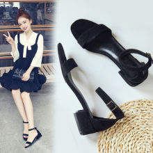 绒面一字扣带中空露趾女凉鞋2017夏季新款女鞋韩版简约粗跟高跟鞋