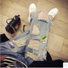 大码破洞牛仔裤女九分裤bf乞丐裤潮 胖mm200斤宽松哈伦小脚裤春夏