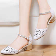 包头凉鞋女夏2017新款镂空水钻尖头粗跟女鞋一字带中跟中年妈妈鞋