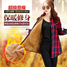 秋冬新款棉女装加绒格子长袖衬衫韩版中长款大码加厚修身保暖衬衣