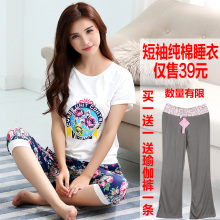 买一送一纯棉短袖睡衣女夏季七分裤中年套装两件套薄款妈妈家居服