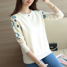 恋淑2016秋季新款韩版圆领直筒套头刺绣小花针织衫毛衣女装打底衫