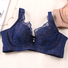 薄款聚拢全蕾丝文胸 绽放蓝色大码聚拢透气侧收上托调整型内衣