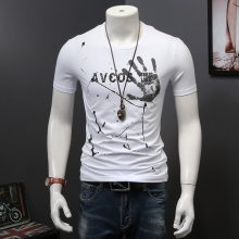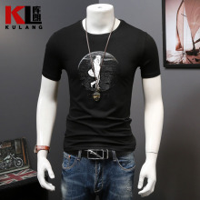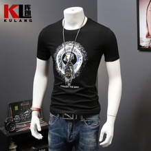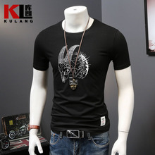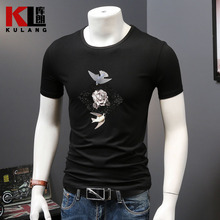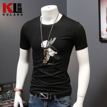 库朗夏装男士短袖T恤2017新款圆领百搭男装体恤衫烫钻烧花半截袖