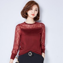 春秋季装新款韩版蕾丝衫拼接针织衫修身圆领长袖上衣打底衫女T恤