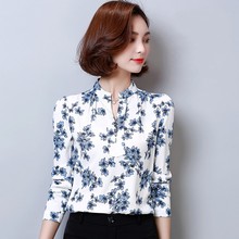 2016新款长袖衬衫女秋季立领修身雪纺衫印花OL韩版职业女装上衣