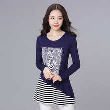 2017春季新款韩版宽松大码中长款打底衫印花圆领长袖T恤女上衣