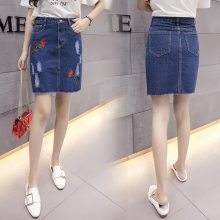 2017夏季新款刺绣花朵破洞流苏浅蓝色牛仔短裙女高腰包裙半身裙子