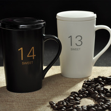 宝发简约马克杯 陶瓷磨砂数字水杯带盖带勺 广告礼品杯子logo定制