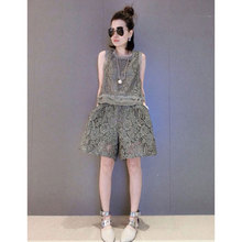 欧洲2017夏新款女装欧货潮站蕾丝镂空拼短裤阔腿裤套装时尚两件套