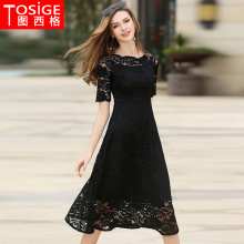 2017新款欧美黑色短袖中长款裙子显瘦弹力蕾丝连衣裙女一字肩夏裙