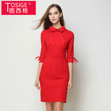 2017新款春装春秋包臀裙子娃娃领七分袖敬酒红色回门礼服连衣裙女