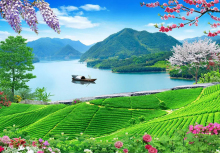 覆膜防水纸画郁金香公园山水风景瀑布画现代装饰画纸制墙贴画年画