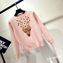 2016简约钉珠领口镶钻圆领套头长袖宽松打底衫针织衫毛衣女