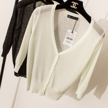 2017新款小香风珍珠扣V领七分袖小开衫薄针织衫小外搭空调衫女