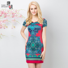 2017新款民族风复古修身显瘦包臀气质大码印花连衣裙短袖女夏季裙
