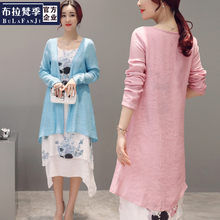 加肥加大码女装两件套2017春装新款胖mm长袖披肩印花中长款连衣裙