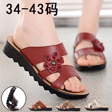 夏中年妈妈鞋真皮中老年凉拖鞋坡跟老人凉鞋拖41大码42平底女鞋43